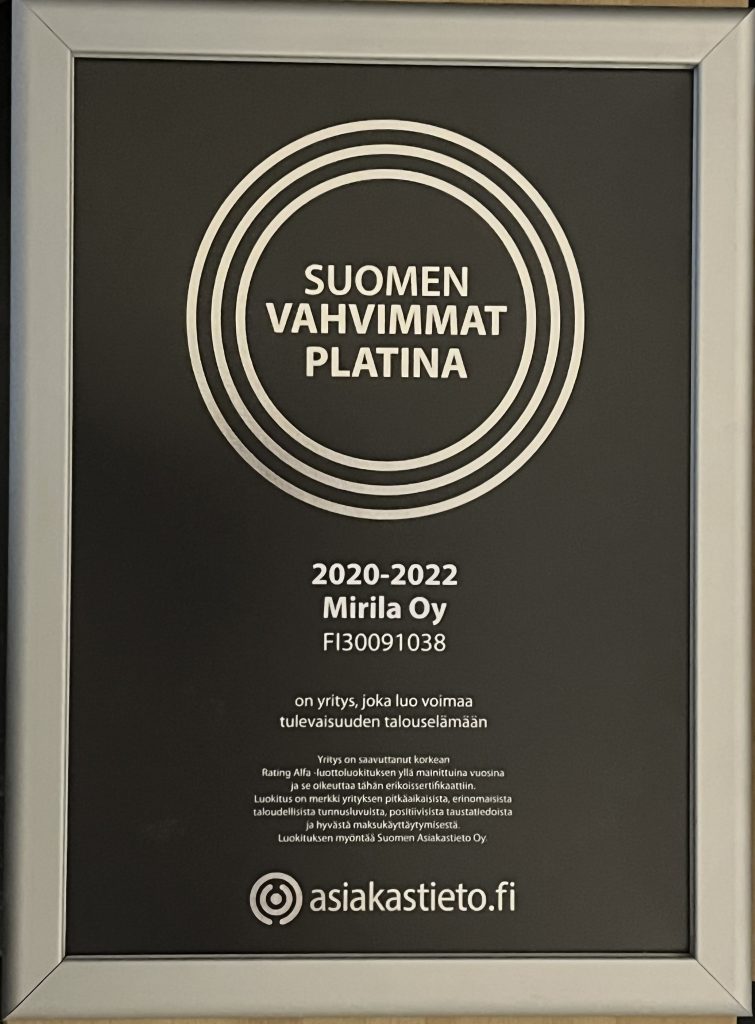 Suomen Asiakastieto Oy on myöntänyt meille ”Suomen Vahvimmat Platina”-luottosertifikaatin jo useampana vuonna.